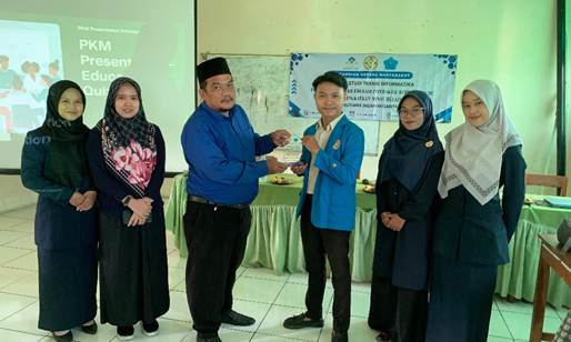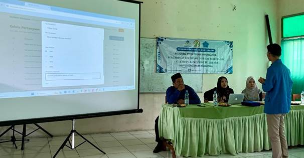 Kegiatan diawali dengan penyerahan plakat kepada pihak sekolah sebagai simbol kerja sama dan implementasi program. Selanjutnya, tim PKM memberikan pemaparan mengenai manfaat web edukasi interaktif sebagai alat bantu pembelajaran modern, termasuk penjelasan mengenai bagaimana gamifikasi dapat meningkatkan fokus, partisipasi, dan pencapaian akademik siswa.