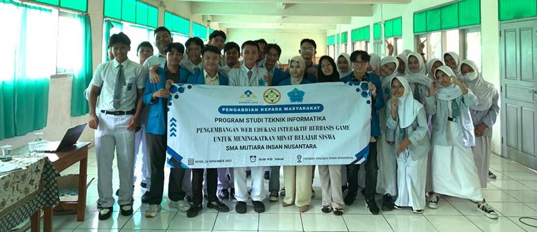 Dalam rangka mendukung peningkatan kualitas pembelajaran berbasis teknologi, Dosen dan Mahasiswa Program Studi Teknik Informatika Universitas Pamulang (UNPAM) melaksanakan kegiatan Pengabdian Kepada Masyarakat (PKM) bertema “Pengembangan Web Edukasi Interaktif Berbasis Game untuk Meningkatkan Minat Belajar Siswa SMA Mutiara Insan Nusantara.”